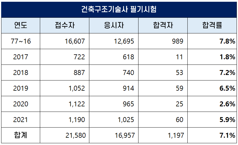 아래 표는 건축구조기술사 자격시험이 처음 시행된 1977년부터 2021년까지 역대 건축구조기술사 필기시험 접수자, 응시자, 합격자 및 합격률 현황인데요.