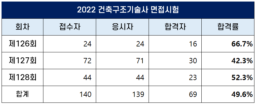 2022년 제126회 건축구조기술사 면접 시험에서는 24명의 응시인원 중 16명이 합격해 66.7%의 합격률을 기록했고, 127회 시험에서는 71명의 응시자 중 30명이 합격해 42.3%의 합격률을 기록했으며, 128회 시험에서는 44명의 응시자 중 23명이 합격해 52.3%의 합격률을 기록했습니다.