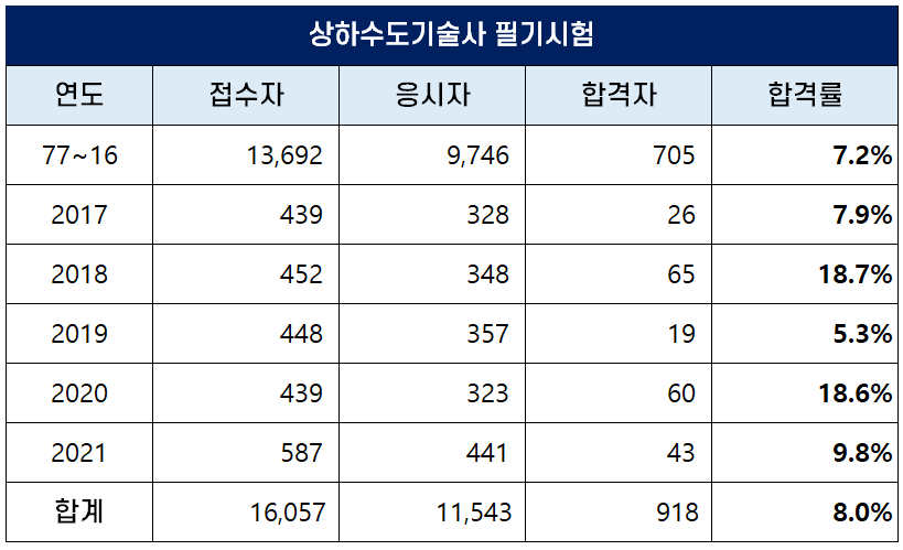 상하수도기술사를 포함한 기술사 자격시험 필기시험은 기사나 산업기사 등 하위 국가기술자격과 달리 객관식이 아닌 주관식 논술형으로 시행되기 때문에 합격률이 상당히 낮은 편입니다.