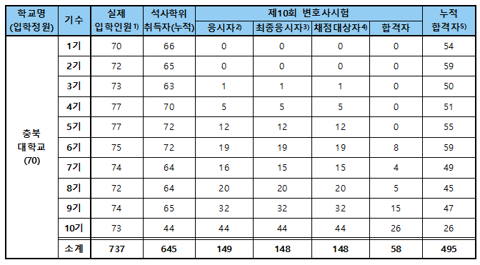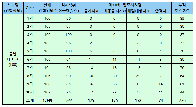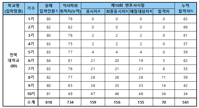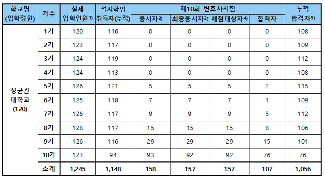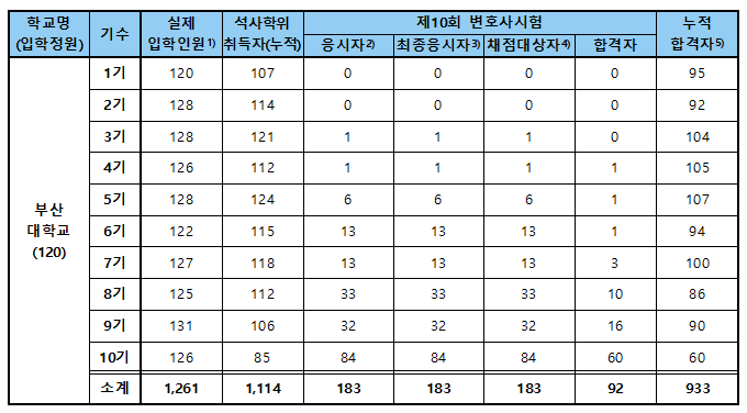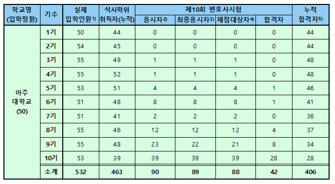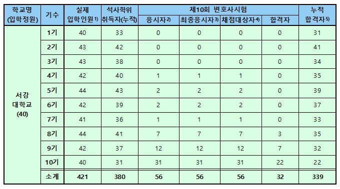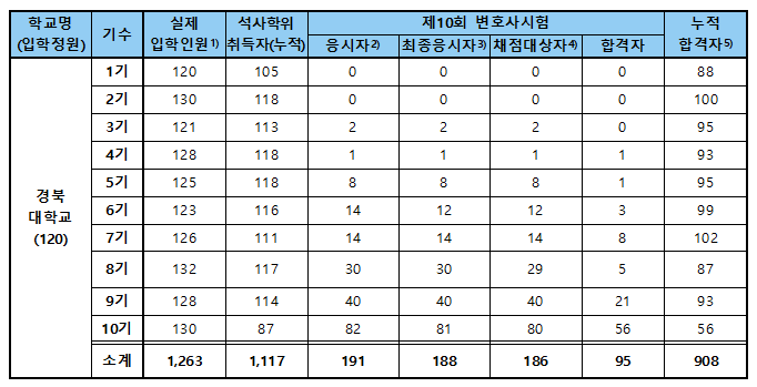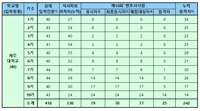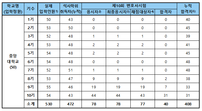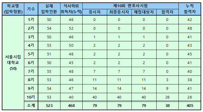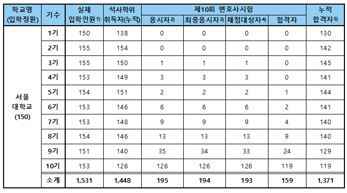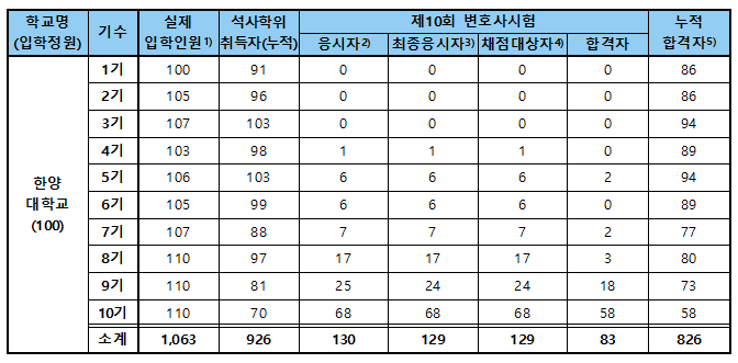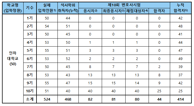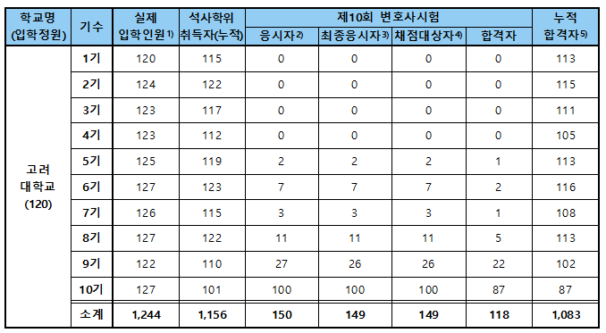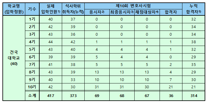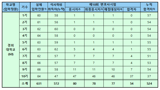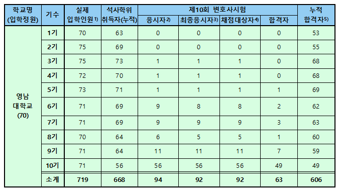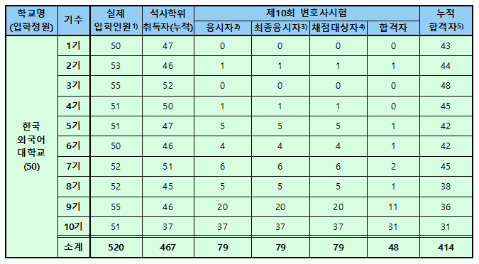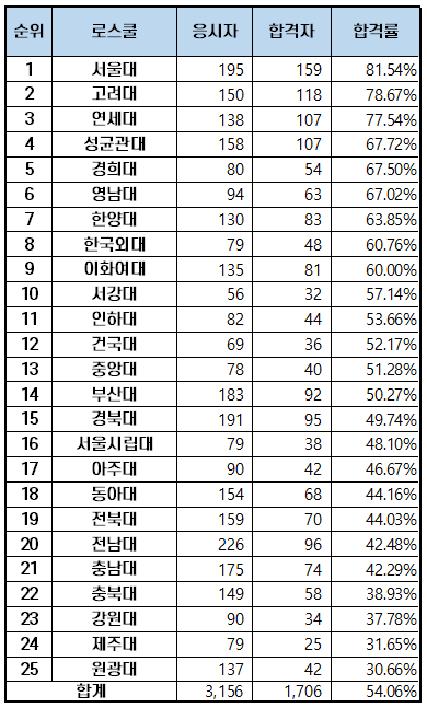 국내 로스쿨이 있는 대학 25개 중에서 평균 합격률 54.06%를 넘는 대학은 10개(서울대, 고려대, 연세대, 성균관대, 경희대, 영남대, 한양대, 한국외대, 이화여대, 서강대)에 불과합니다.