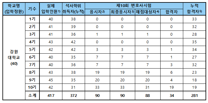 강원대의 합격률은 37.78%로 23위를 기록했습니다. 하지만 10기 졸업생의 합격률인 초시 합격률은 57.58%를 기록하여 평균 합격률보다 높습니다.