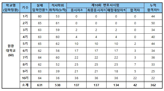 10회 변호사시험 합격률 1위를 차지한 대학은 서울대 로스쿨로 합격률 81.54%를 기록했습니다. 합격률 30.66%를 기록하며 합격률 순위 25위인 꼴찌를 기록한 원광대는 서울대 합격률의 절반도 되지 않습니다.