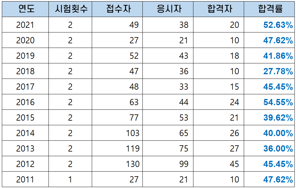 | 연도 | 접수자 | 응시자 | 합격자 | 합격률 |