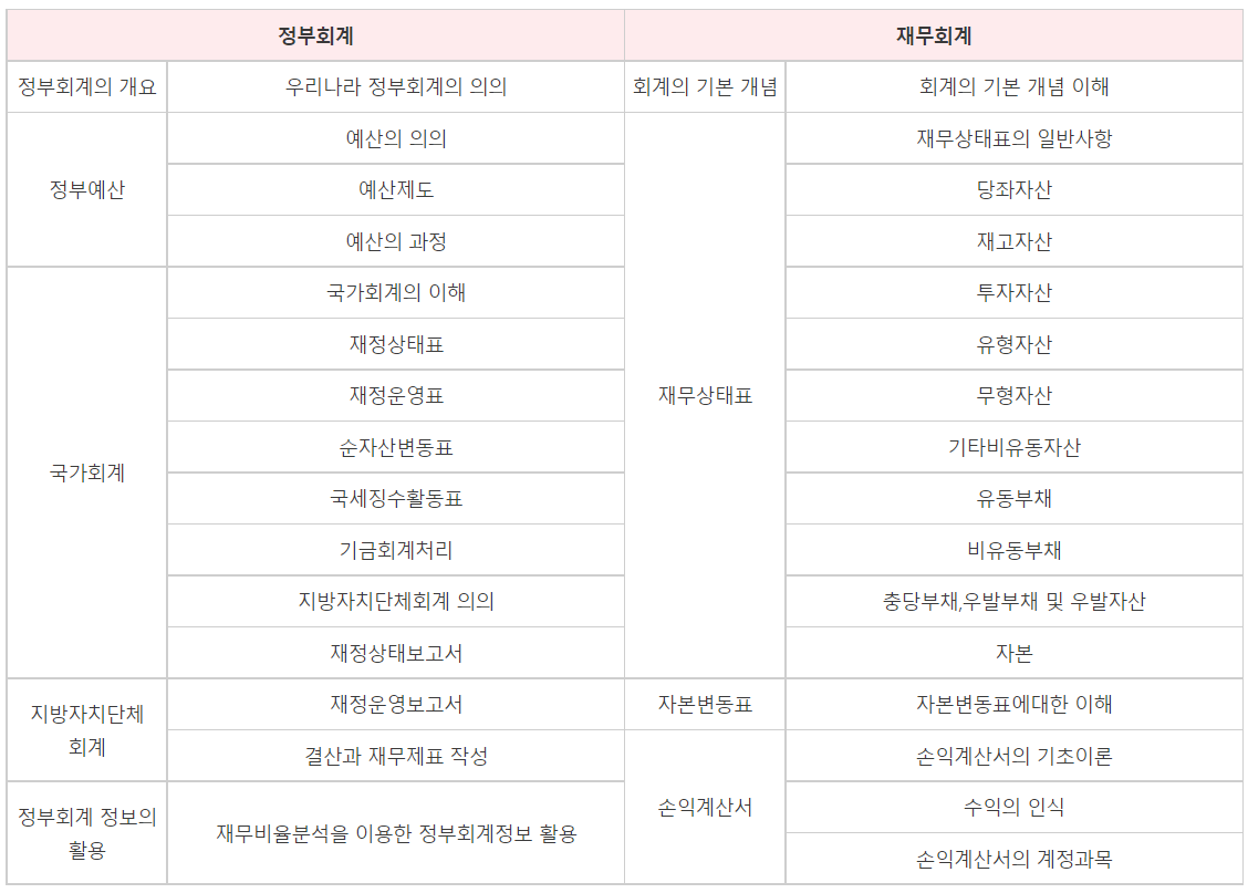 공공회계전문가 자격시험 과목은 ① 정부회계와 ② 재무회계의 2과목인데요. 과목별 세부 출제 범위는 다음과 같습니다.