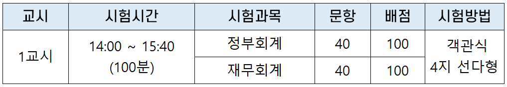 공공회계전문가 자격시험은 과목마다 객관식 4지 선택형 40문제가 출제되어 총 80문항을 100분 동안 풀어야 하는데요. 시험시간표는 다음과 같습니다.