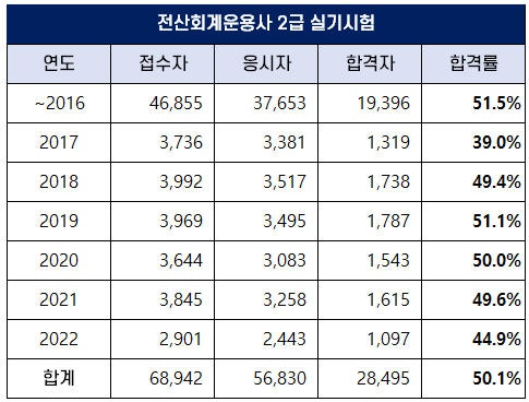 전산회계운용사 2급 실기시험의 평균 합격률은 50%정도로 3급 시험과 마찬가지로 실기 합격률이 필기 합격률보다 높습니다.