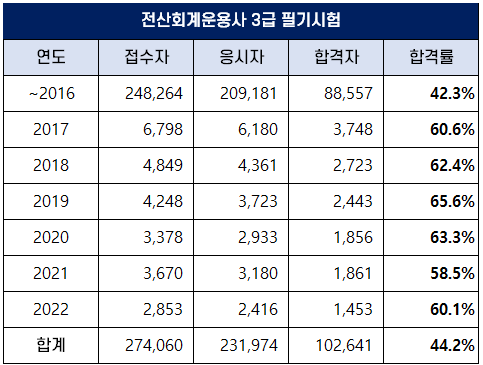 2022년에는 2,416명이 전산회계운용사 3급 필기시험에 응시해 1,453명이 합격했고, 합격률은 60.1%를 기록했습니다.