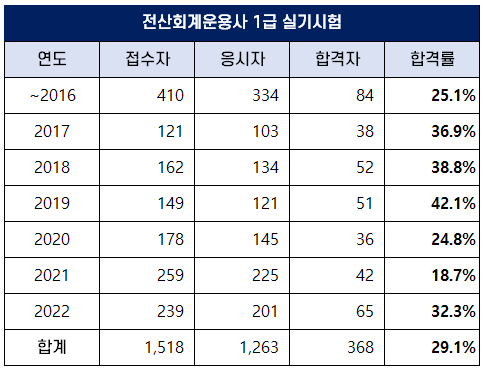 전산회계운용사 1급 실기시험의 평균 합격률은 29%정도로 2급과 3급 시험과 달리 실기 합격률이 필기 합격률보다 낮습니다.