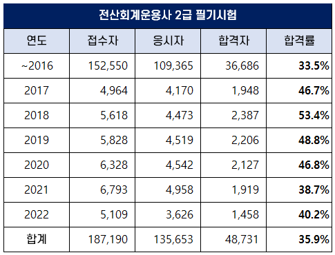 2022년에는 3,626명이 전산회계운용사 2급 필기시험에 응시해 1,458명이 합격했고, 합격률은 40.2%를 기록했습니다.
