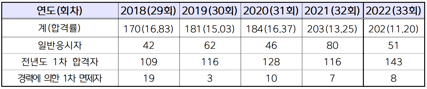 2022년 제33회 감정평가사 2차 시험에는 원서접수자 2,227명 중 80.96%인 1,803명이 시험에 응시했는데요. 이 중 202명이 합격해 합격률은 11.20%을 기록해 지난해 13.26%보다 낮은 합격률을 보였습니다.