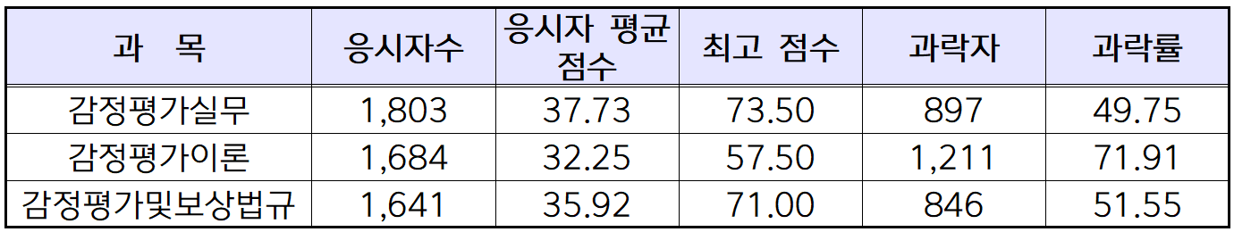 과목별 채점 결과를 보면 감정평가이론 응시자 1,684명 중 1,211명이 과락으로 불합격해 과락률이 71.91%를 기록했습니다.