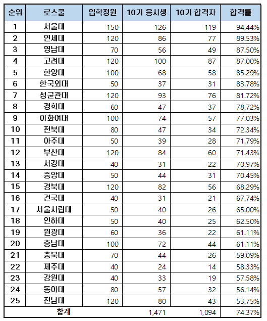 25개 대학 로스쿨의 변호사 시험 초시 합격자와 합격률은 아래 표와 같습니다. 초시 평균 합격률 74.37%보다 높은 합격률을 기록한 로스쿨은 9위까지 9개 대학입니다.
