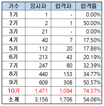 올해 응시생 중에 1,471명이 2021년에 법학석사학위를 취득하는 로스쿨 10기 졸업생입니다. 이번에 처음 변호사시험에 응시한 10기 로스쿨 졸업생 즉, 초시생의 합격률은 74.37%로 평균 합격률보다 20.32%나 높습니다.