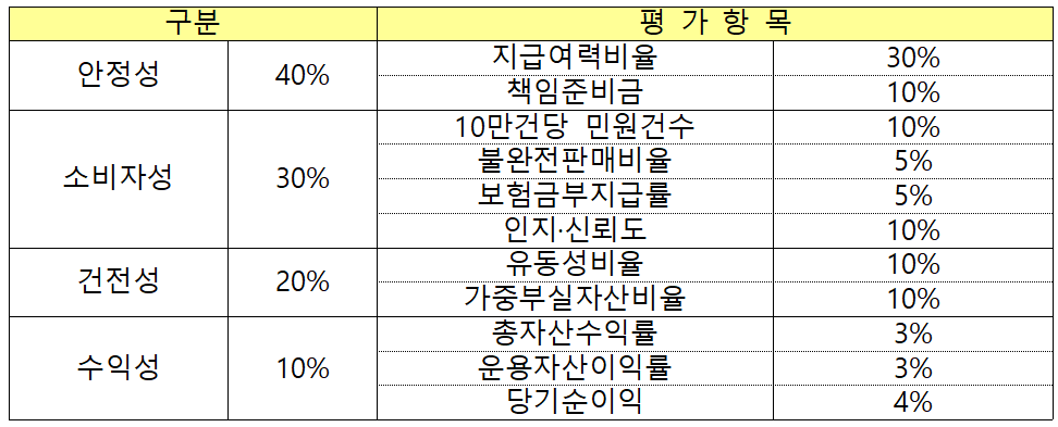 국내에는 총 14개의 손해보험사가 있는데요. 금융소비자연맹에서 2003년부터 매년 14개의 손해보험회사의 결산자료 등을 종합 분석해 안전성(40%), 소비자성(30%), 건전성(20%), 수익성(10%) 등 4대 부문으로 나누어 평가를 한 후 종합 순위를 산정해 좋은 손해보험사 순위를 발표하고 있습니다.