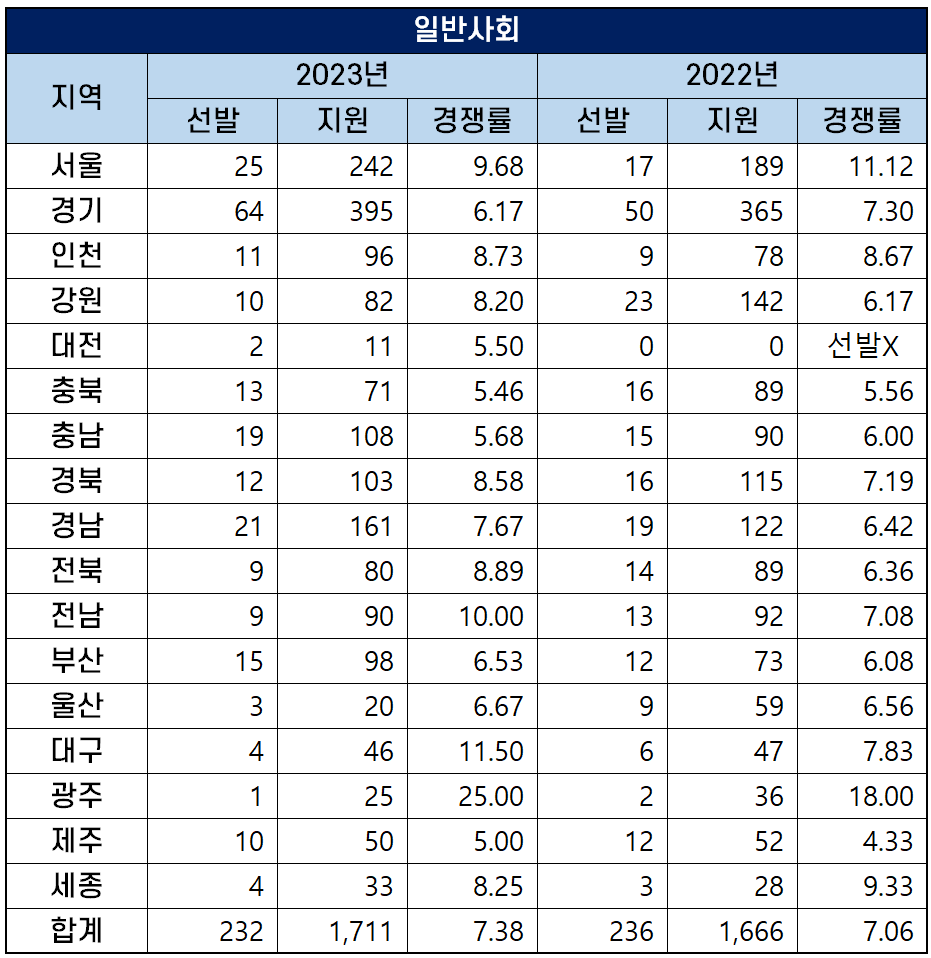 1명을 선발하는 광주의 경쟁률이 41대 1로 가장 높았고, 14명을 선발하는 제주도의 경쟁률이 9.36대 1로 가장 낮았습니다.