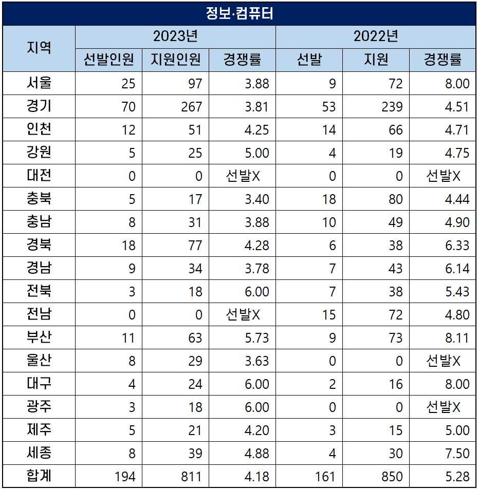 2023년 대전과 전남을 제외한 15개 시도 교육청에서 선발하는 정보·컴퓨터 중등학교 교사 티오는 194명으로, 지난해 티오 161명보다 33명이 늘었습니다.