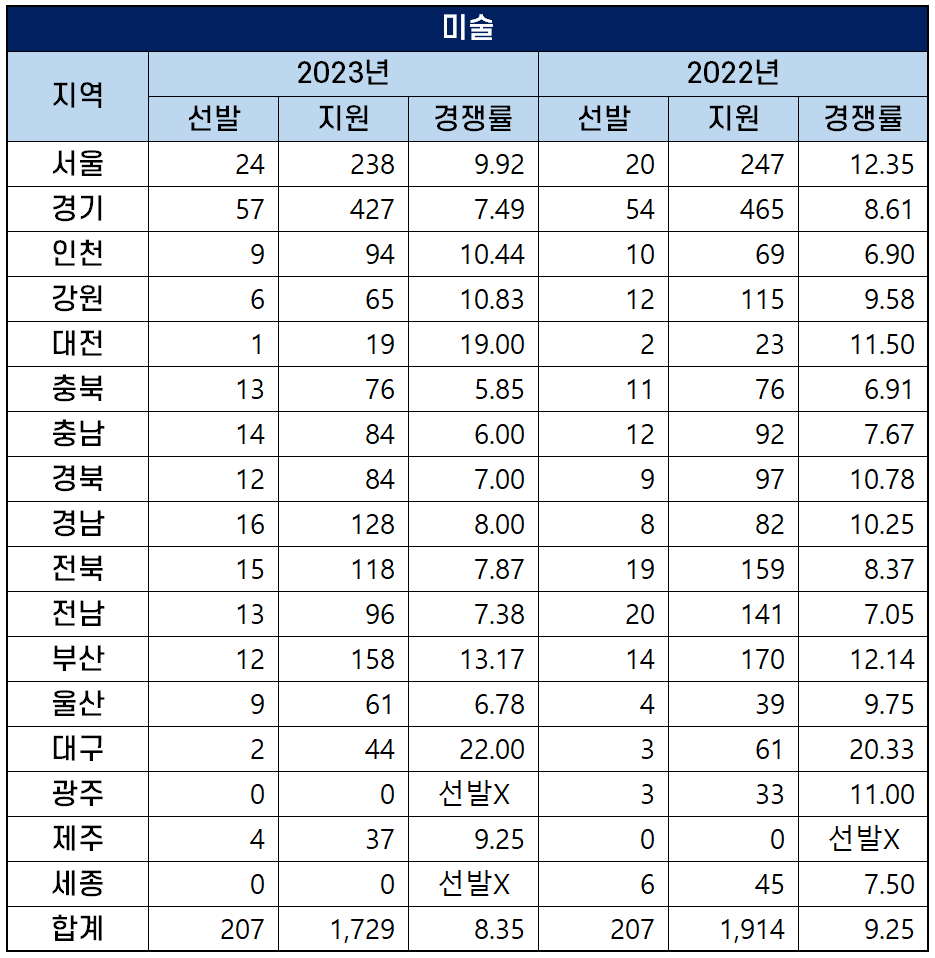 57명으로 가장 많은 인원의 미술 중등교사를 선발하는 경기도에는 427명이 지원해 7.49대 1의 경쟁률을 기록했고, 서울은 9.92대 1, 경남은 8대 1의 경쟁률을 보였습니다.