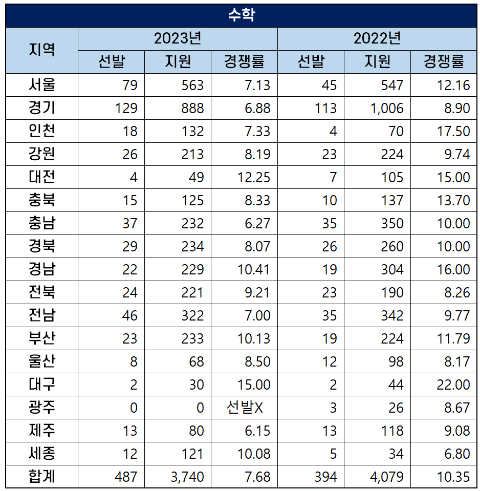 수학 중등교사 487명을 선발하는데 3,740명이 원서접수를 해 평균 경쟁률은 7.68대 1을 기록했는데요. 티오는 증가한 반면 지원자는 감소해 지난해 경쟁률 10.35대 1보다 경쟁률이 하락했습니다.