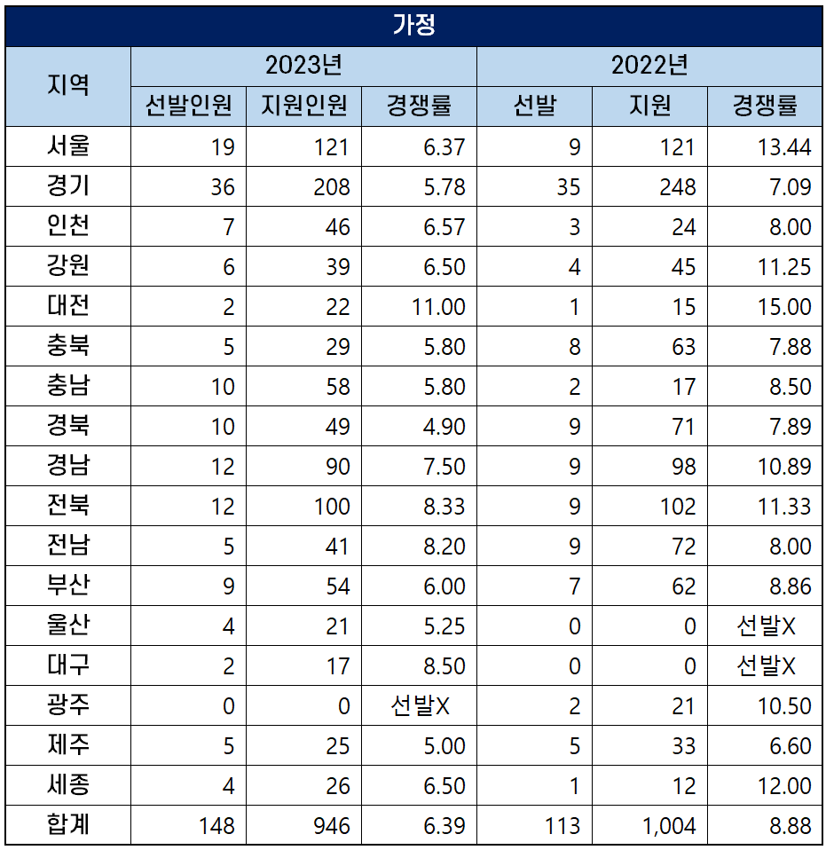 2023년 광주를 제외한 16개 시도 교육청에서 선발하는 가정 중등학교 교사 티오는 148명으로, 지난해 티오 113명보다 35명이 늘었습니다.