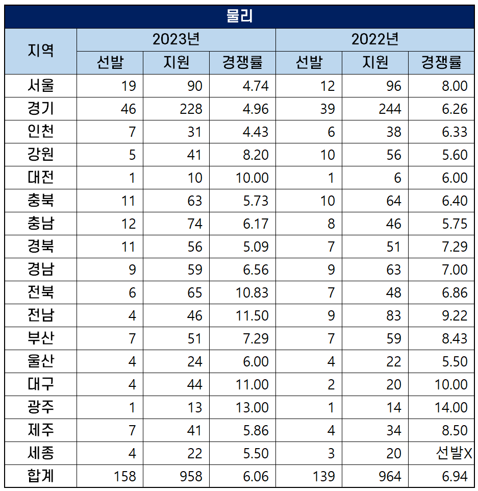 2023년 17개 시도 교육청에서 선발하는 물리 중등학교 교사 티오는 158명으로, 지난해 티오 139명보다 19명이 늘었습니다.
