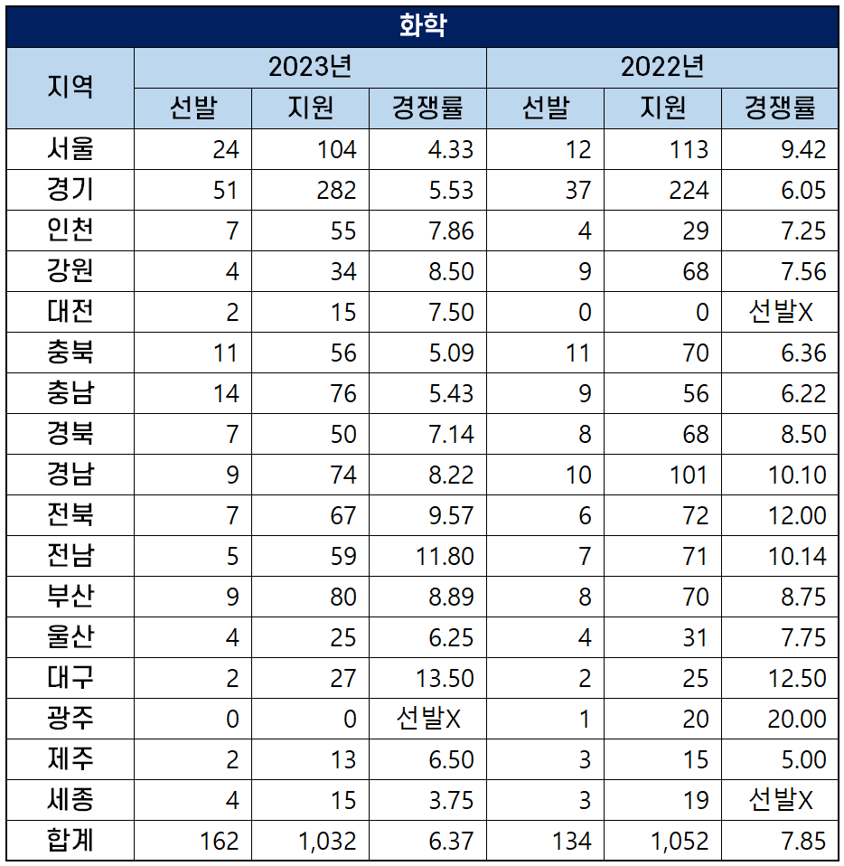 2023년 광주를 제외한 16개 시도 교육청에서 선발하는 화학 중등학교 교사 티오는 162명으로, 지난해 티오 134명보다 28명이 늘었습니다.