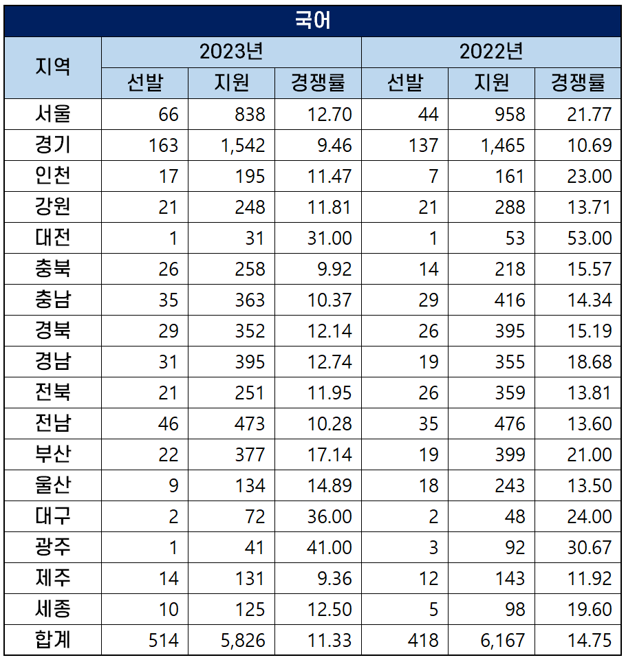 국어 중등교사 514명을 선발하는데 5,826명이 원서접수를 해 평균 경쟁률은 11.33대 1을 기록했는데요. 티오는 증가한 반면 지원자는 감소해 지난해 경쟁률 14.75대 1보다 경쟁률이 하락했습니다.