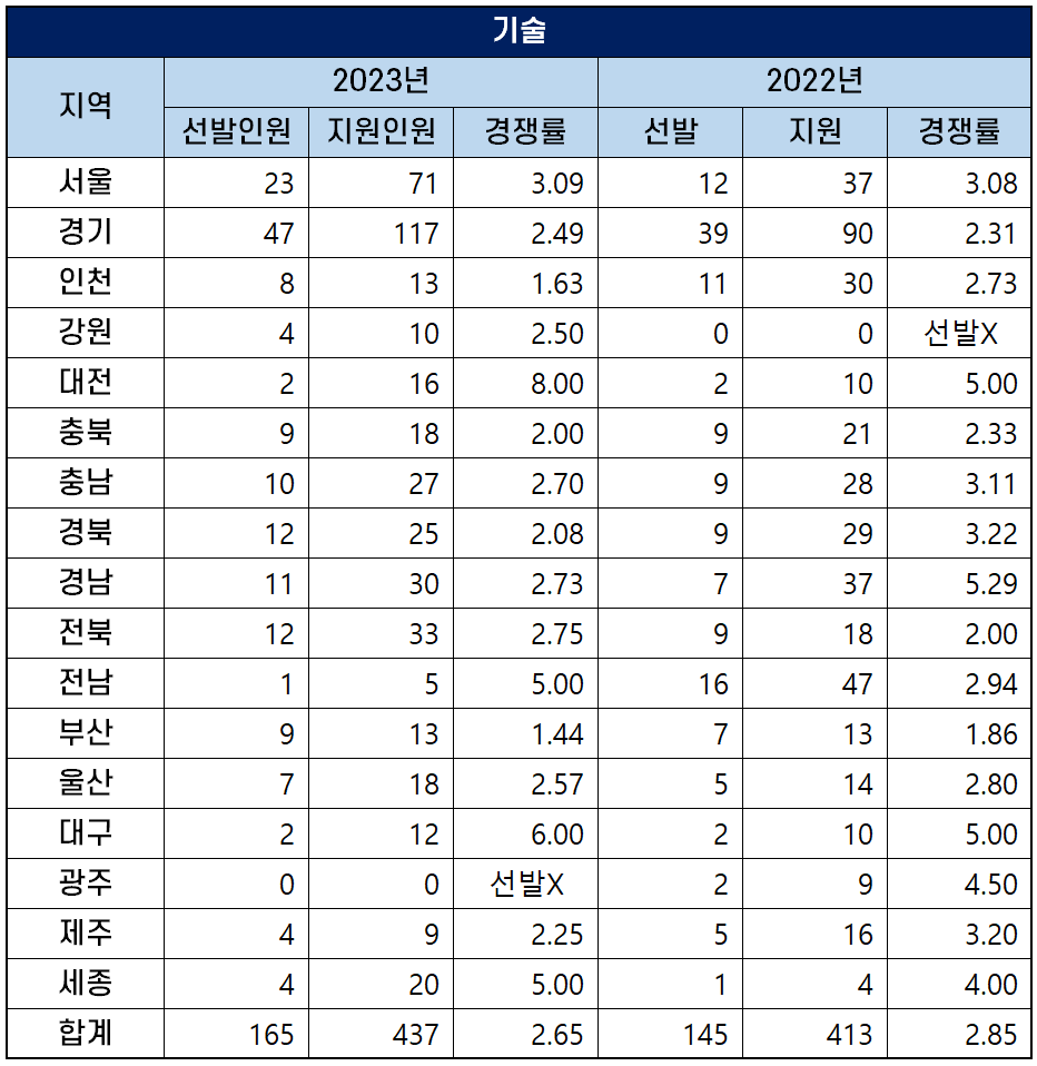 2023년 광주를 제외한 16개 시도 교육청에서 선발하는 기술 중등학교 교사 티오는 165명으로, 지난해 티오 145명보다 20명이 늘었습니다.