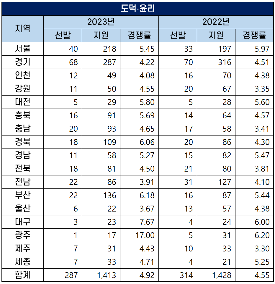 이번 포스팅에서는 2023학년도 17개 시도 교육청에서 시행하는 중등학교교사 임용후보자 선정경쟁시험 중 주요 교과과목(국어, 수학, 물리, 화학, 생물, 지구과학, 일반사회, 역사, 지리, 도덕·윤리, 체육, 음악, 미술, 영어, 기술, 가정, 정보·컴퓨터)의 티오와 경쟁률을 비교 정리했습니다.