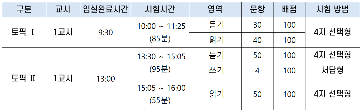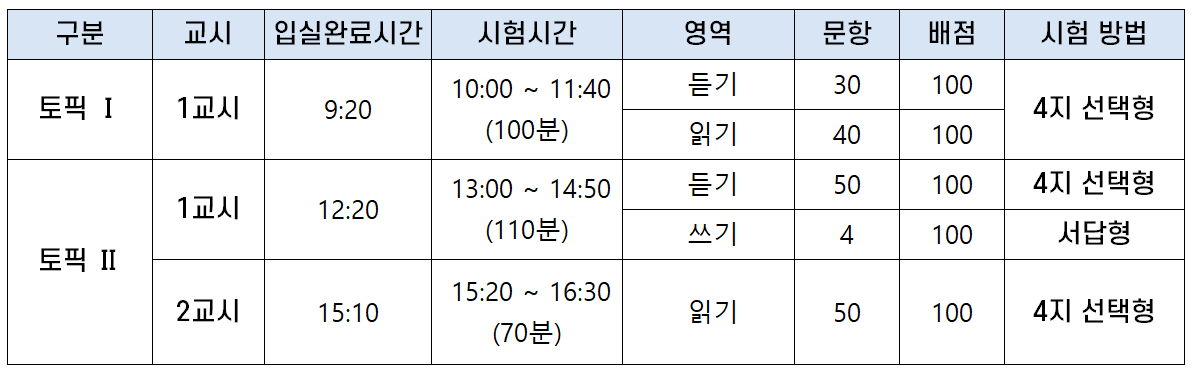 | 토픽 Ⅱ | 1교시 | 12:20 | 13:00 ~ 14:50 (110분) |