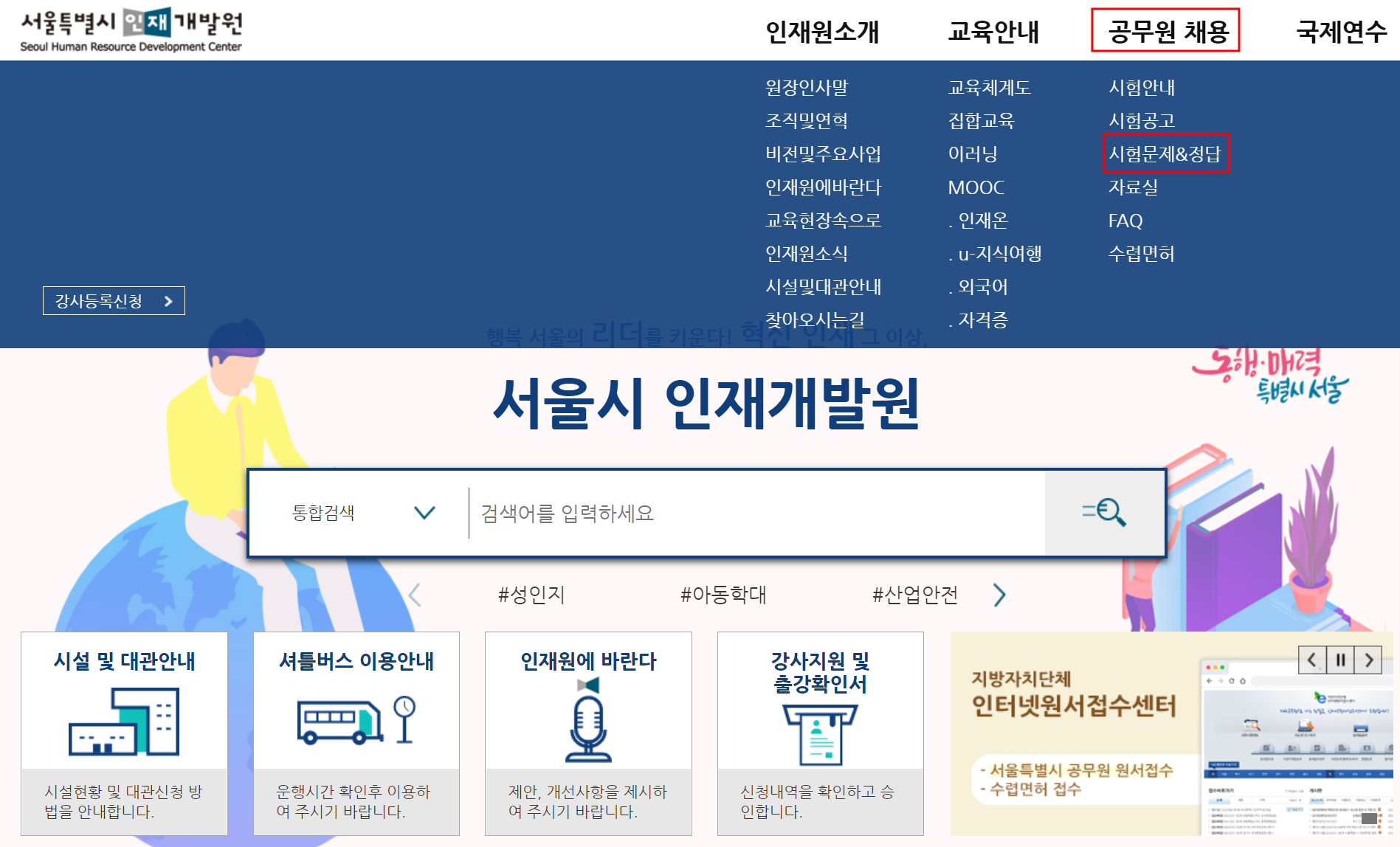 먼저 아래와 같이 서울특별시 인재개발원 홈페이지 공무원 채용탭에서 시험문제 & 정답을 클릭하세요.