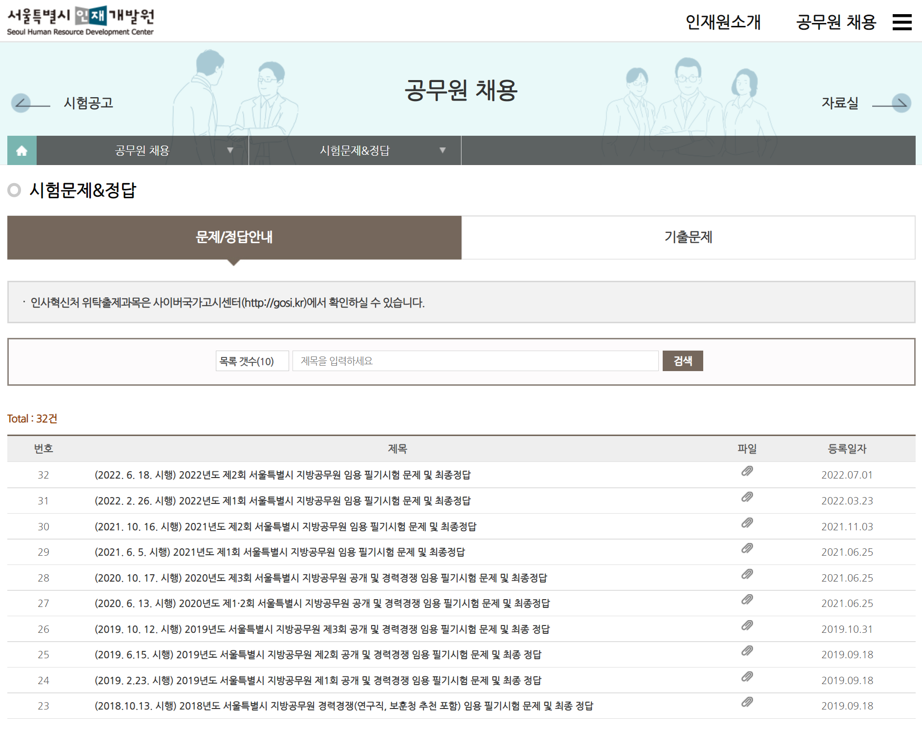 서울시가 자체 출제하는 공채 시험 과목과 경채 시험 문제 및 정답은 서울특별시 인재개발원 홈페이지에서 다운로드받을 수 있는데요.