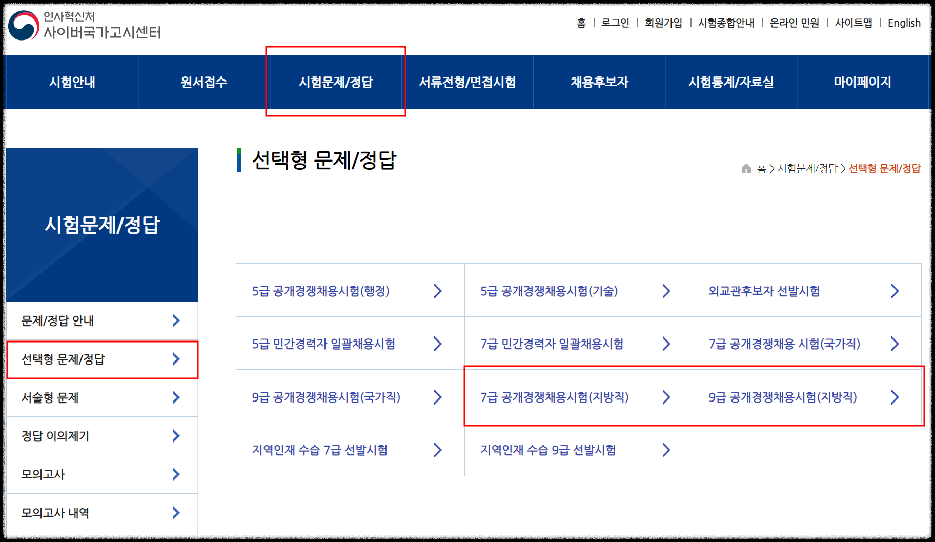 인사혁신처 사이버국가고시센터 홈페이지에서 시험문제/정답 탭을 클릭하고 선택형 문제/정답을 탭을 클릭하면, 아래와 같이 인사혁신처가 출제하는 7급 지방직 공채 및 9급 지방직 공채 시험 과목 문제를 볼 수 있습니다(아래 그림을 클릭하면 이동).