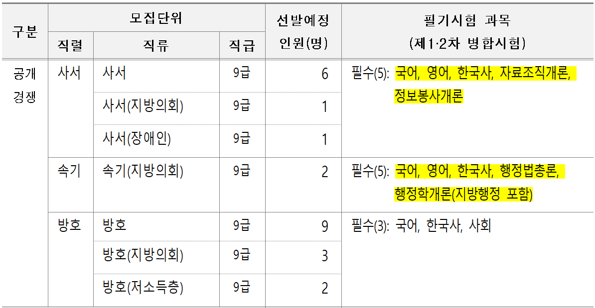 서울특별시 지방공무원 임용시험 시행계획 공고를 보면 아래와 같이 필기시험 과목에 노란음영표시가 된 시험 과목이 인사혁신처에 위탁출제하고 있는 과목인데요. 예를 들어 9급 공채 중 사서직 시험 과목인 국어, 영어, 한국사, 자료조직개론, 정보봉사개론 시험 문제는 인사혁신처에서 위탁출제하고 있지만, 9급 공채 중 방호직 시험 과목인 국어, 한국사, 사회 과목은 서울시가 출제하고 있습니다.