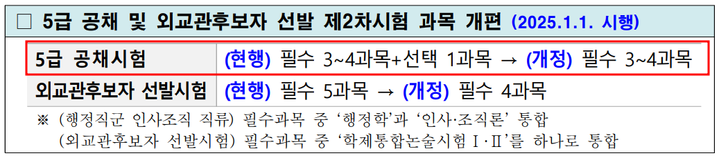 현행 행정고시를 포함한 5급 공채 2차 필기 시험 과목은 필수 3~4과목과 선택과목 1과목으로 구성되는데요. 개정된 공무원 임용시험령에 따르면 2025년부터 선택과목이 폐지되고, 필수 3~4과목만으로 시험을 보게 됩니다.