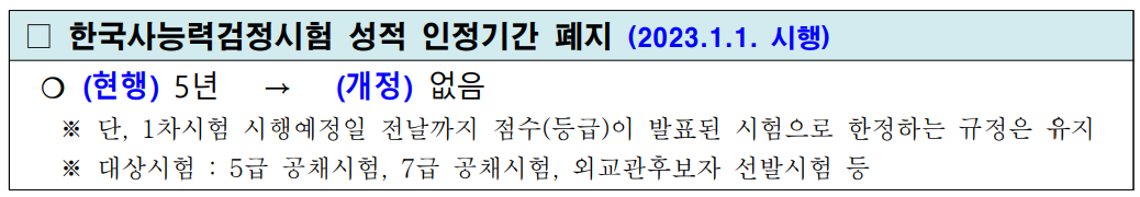 2022년까지 한국사 시험 과목을 대체하는 한국사능력검정시험의 성적 인정기간은 5년이었는데요. 2023년부터는 성적 인정기간이 사라져 기준 등급 이상의 한국사 시험 성적을 취득한 수험생은 취득시기와 상관없이 유효하게 인정받을 수 있게 되었습니다.