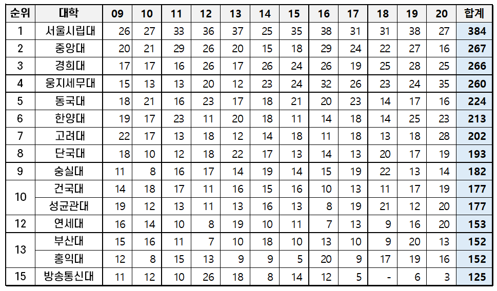 2009년부터 2020년까지 세무사 누적 합격 자 수는 서울시립대가 384명으로 1위입니다. 2위는 267명의 합격자를 배출한 중앙대, 3위는 266명의 합격자를 배출한 경희대가 차지했습니다.