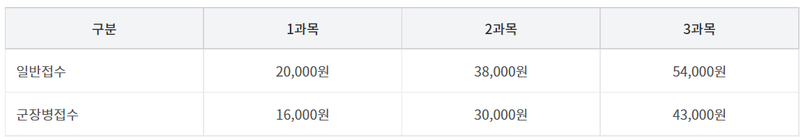 1과목을 응시할 경우 응시료는 2만 원이고, 2과목은 3만 8천 원, 3과목은 5만 4천 원입니다.