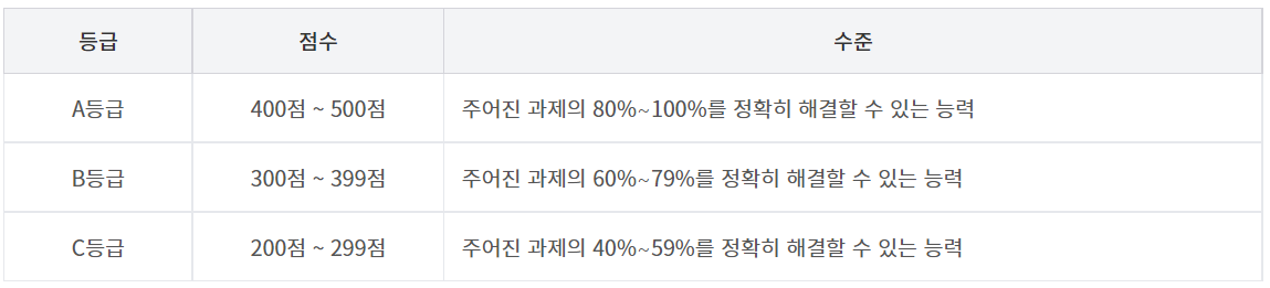 필기시험없이 실기시험만으로 합격자를 결정하는 ITQ 시험은 500점 만점을 기준으로 200점 미만을 득점하면 불합격이고, 아래 표에 같이 점수에 따라 A등급부터 C등급까지 등급별 자격을 부여하고 있습니다.