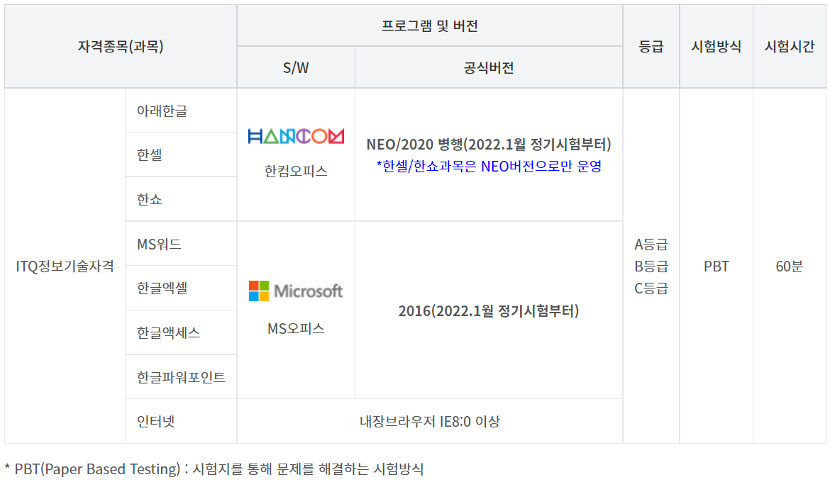 ITQ 자격시험은 아래한글, 한셀, 한쇼, MS워드, 한글엑셀, 한글액세스, 한글파워포인트, 인터넷의 8가지 과목으로 구성되는데요. 8과목 중 1과목만 응시해 합격해도 국가공인자격증을 부여하고 있습니다.
