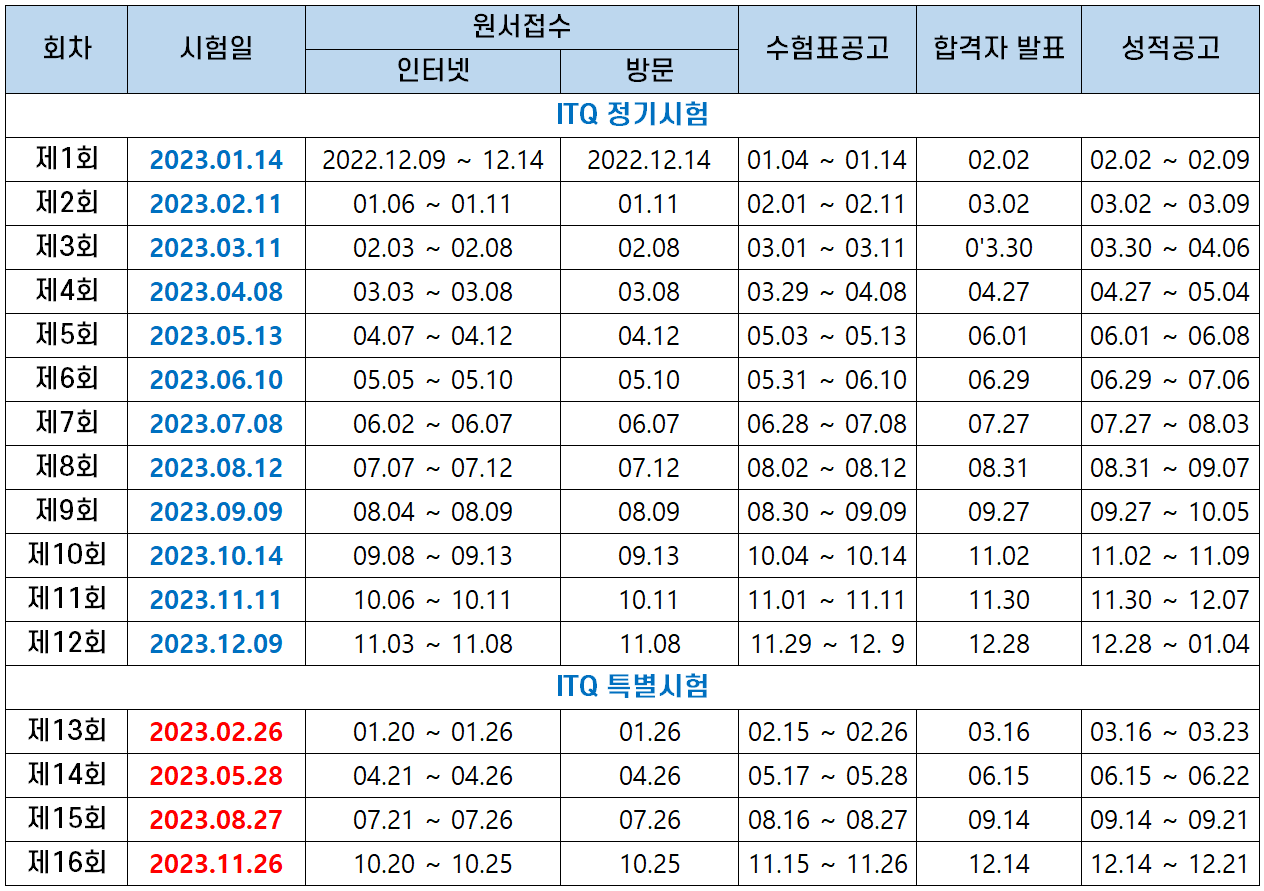 2023년에 시행되는 ITQ 시험 날짜, 원서접수기간, 합격자 발표일 및 성적 공고 등의 시험 일정은 다음과 같습니다.