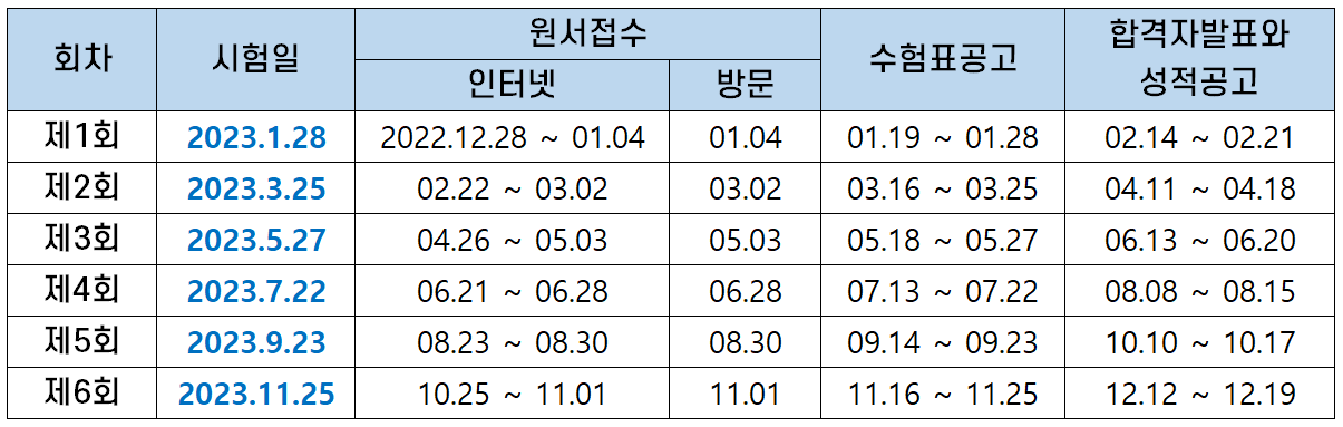 | 회차 | 시험일 | 원서접수 | 수험표공고 | 합격자발표와 성적공고 |