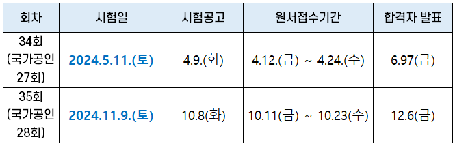 연 3회 또는 5회 실시된 적도 있으나 2019년부터 연 2회로 변경되었고, 2020년과 2021년에는 코로나 19의 영향으로 연 1회 시행되었으나 2022년부터는다시 연 2회 시험이 시행되고 있습니다.