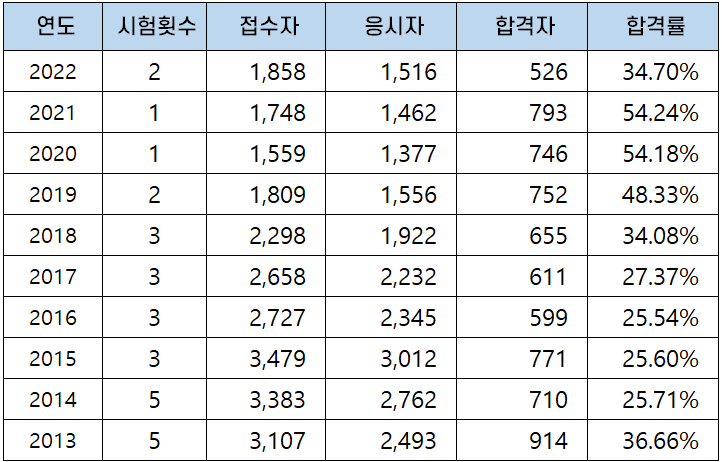 25% 내외를 보이던 합격률이 2017년부터 꾸준히 증가하여 2018년에는 34.08%, 2019년에는 48.33%, 2020년에는 54.18%, 2021년에는 54.24%의 합격률을 기록했고, 2022년에는 조금 낮아져 34.70%의 합격률을 보였습니다.