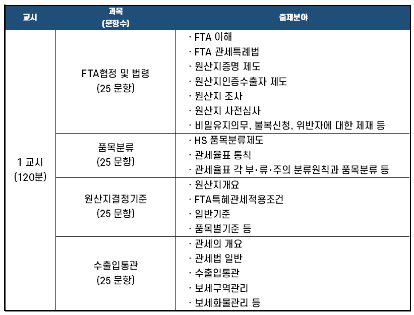 원산지관리사 시험은 FTA협정 및 법령, 품목분류, 원산지 결정기준, 수출입통관의 4과목으로 구성됩니다. 과목당 25문제가 출제되며 총 100문제를 120분 동안 풀어야 합니다.
