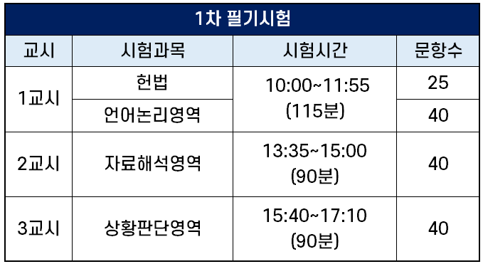 영어와 한국사 과목은 검정시험으로 대체하기 때문에 1차 필기 시험일에는 아래 시간표에 따라 헌법과 PSAT 3가지 영역만 시험을 봅니다. 헌법은 객관식 4지 선택형 25문항, PSAT은 영역 당 객관식 5지 선택형 40문항이 출제됩니다.