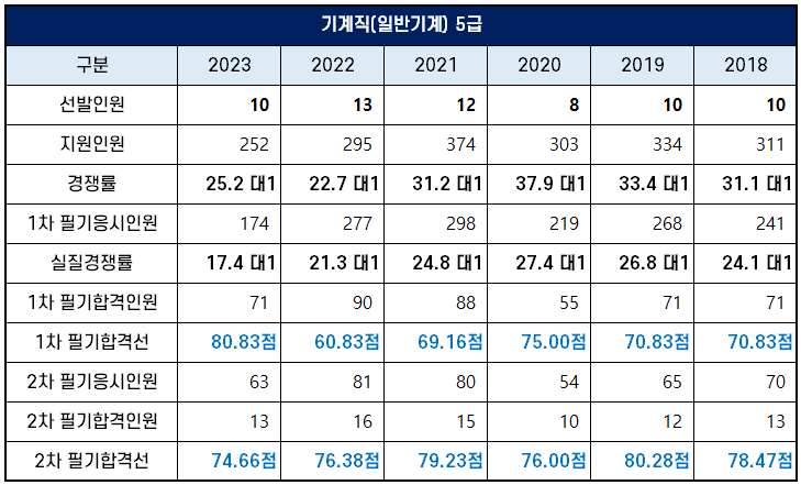 최근 시행된 5급 기계직(일반기계 직류) 시험 선발인원, 경쟁률, 필기 합격선 등을 아래 표로 정리했습니다(모바일 환경에서는 표 아래 있는 그림을 보시기 바랍니다).