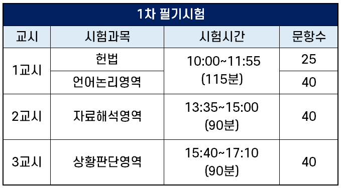영어와 한국사 과목은 검정시험으로 대체하기 때문에 1차 필기 시험일에는 아래 시간표에 따라 헌법과 PSAT 3가지 영역만 시험을 봅니다. 헌법은 객관식 4지 선택형 25문항, PSAT은 영역 당 객관식 5지 선택형 40문항이 출제됩니다.