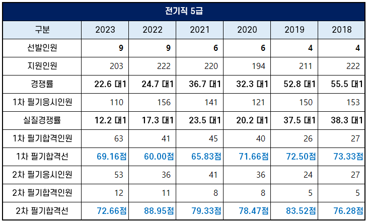 최근 시행된 5급 전기직(공업직렬 전기직류) 시험 선발인원, 경쟁률, 필기 합격선 등을 아래 표로 정리했습니다(모바일 환경에서는 표 아래 있는 그림을 보시기 바랍니다).